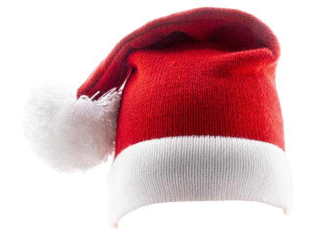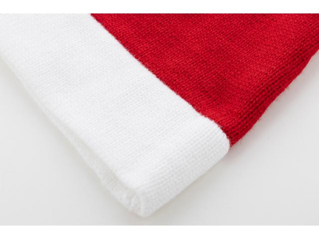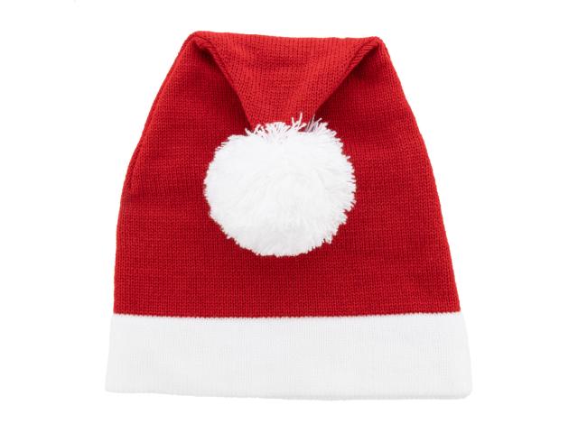 Knitted Christmas Santa hat in acrylic with white trim and bobble.