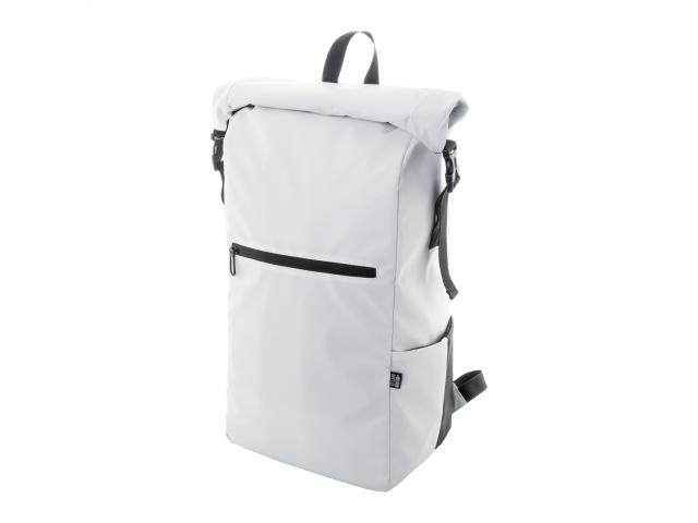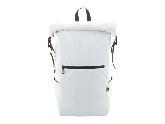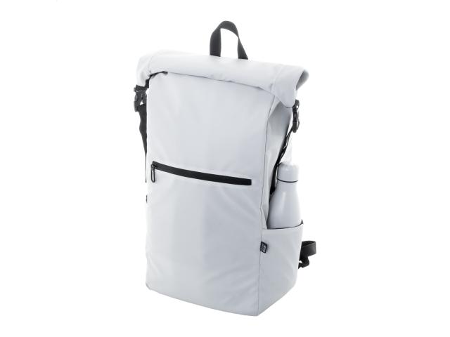 Waterproof, rolltop backpack in RPET with buckle and velcro closure, padded laptop (16") and tablet (10") compartment, zipped front pocket, side pockets, padded back and shoulder straps. PU coated 600D RPET polyester, with distinctive RPET label.