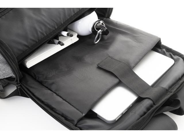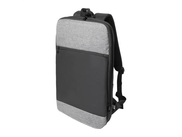 RPET extendable backpack with zipped main compartment, zipped front pocket, padded laptop (15") compartment and PU coated front side. With trolley strap, padded back and shoulder straps. 600D RPET polyester, with distinctive RPET label.