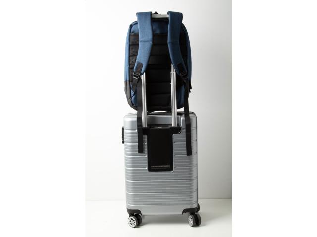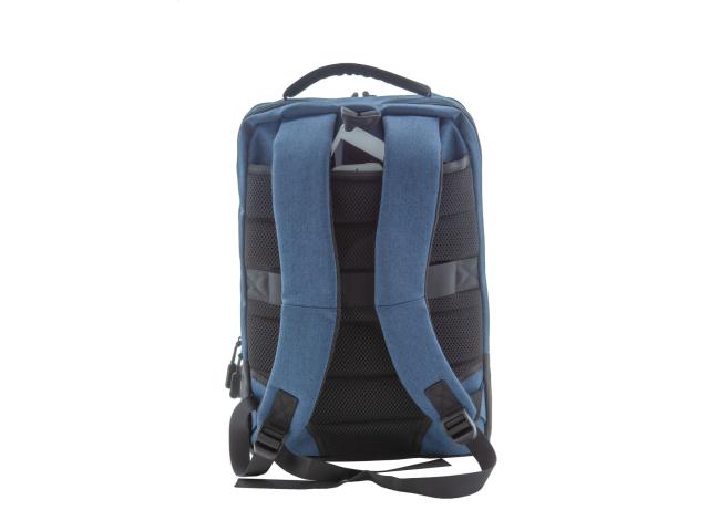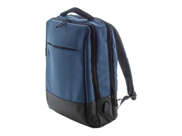 Two-tone backpack with multiple zipped compartments, inside organiser pockets, padded laptop (17") compartment, ergonomic back and shoulder straps. With anti-theft pocket, trolley strap and built-in USB connection for power banks. 400D polyester.