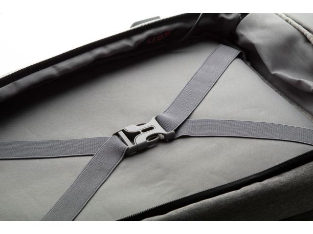 Backpack with multiple zipped compartments, inside organiser pockets, padded laptop (15") and tablet compartments, ergonomic back and shoulder straps. With trolley strap and built-in USB connection for power banks. 400D polyester.