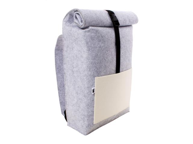 Custom made, RPET felt rolltop backpack with one compartment and full colour printed front pocket. With distinctive RPET label. Price includes sublimation printing. MOQ: 25 pcs.