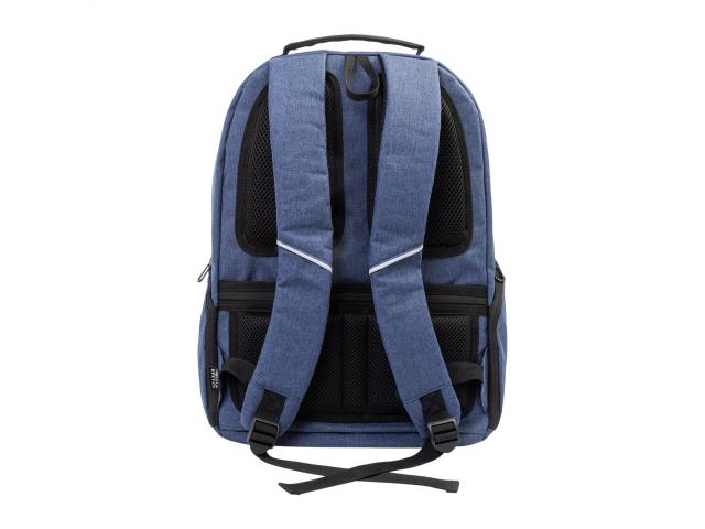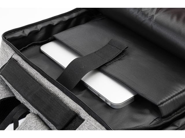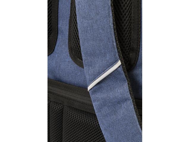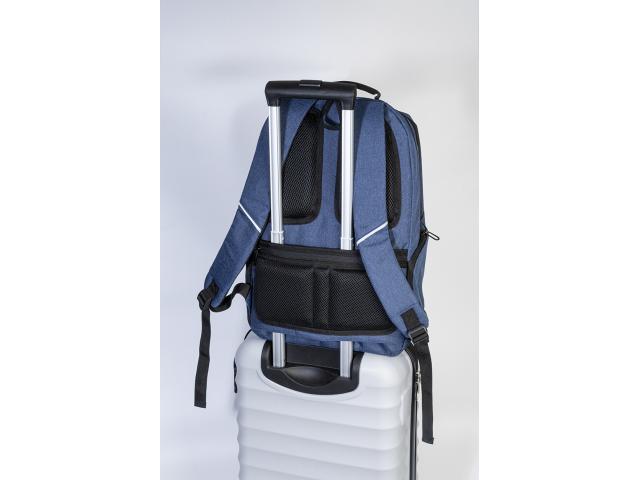 RPET backpack with zipped compartments, 2 zipped front pockets, zipped side pockets and padded laptop (15") compartment. With padded back and shoulder straps, anti-theft pocket and trolley strap. With 300D RPET polyester, with distinctive RPET label.