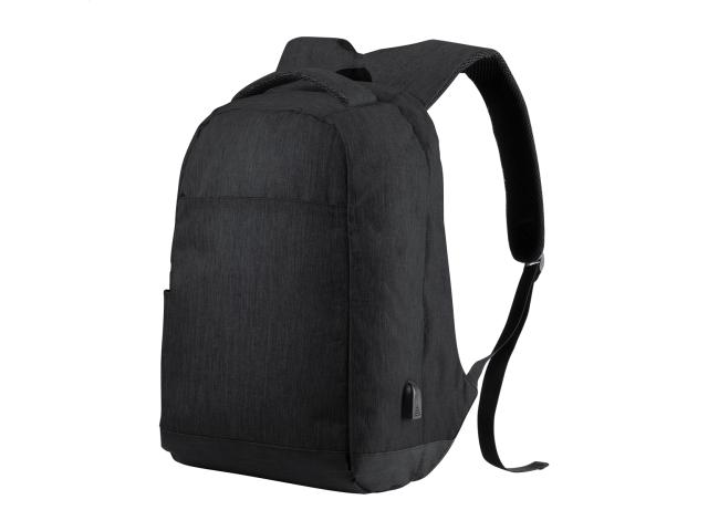Anti-theft backpack with multiple pockets, padded laptop (15") and tablet (12") compartment, padded back and shoulder strap. With trolley strap and built-in USB connection for power banks. 300D Polyester.