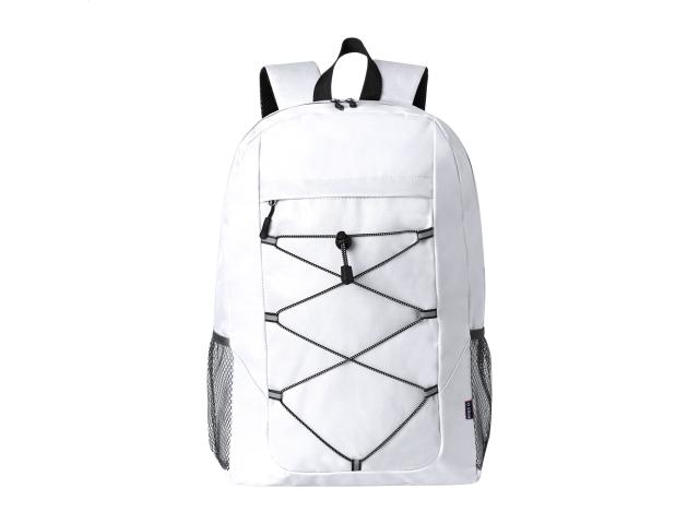 RPET backpack with zipped compartment and front pocket, mesh side pockets, padded back and shoulder straps. 600D RPET polyester with distinctive RPET label.