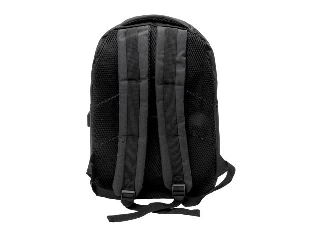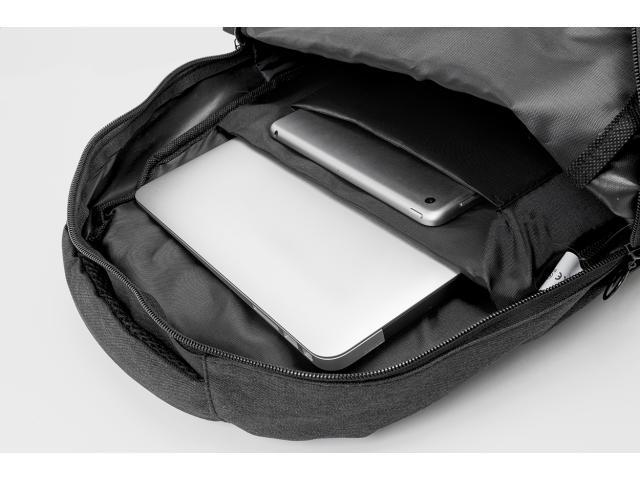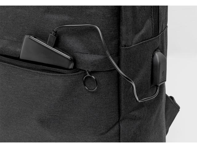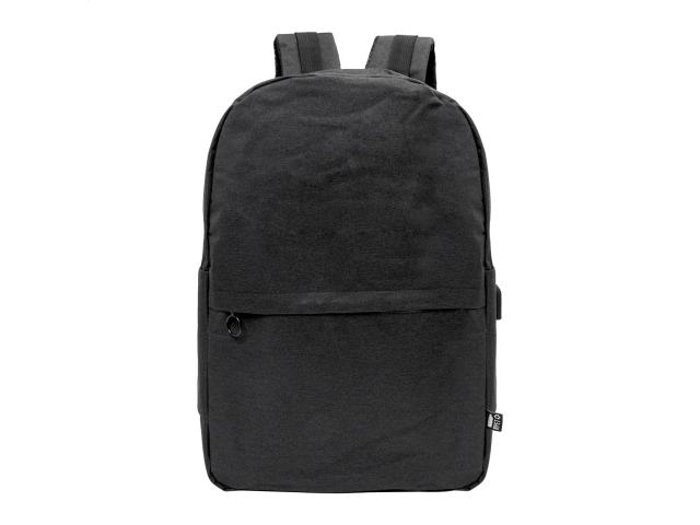 Backpack with zipped compartments, padded laptop (15") and tablet (10") compartment, padded back and shoulder straps. With distinctive RPET label and built-in USB connection for power banks. 600D RPET polyester.