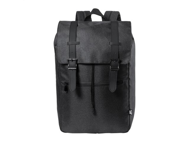RPET backpack with padded laptop (15") and tablet (12") compartment, zipped front pocket, padded back and shoulder straps. Main compartment with drawstring and magnetic snap button closure. 300D RPET polyester. With distinctive RPET label.