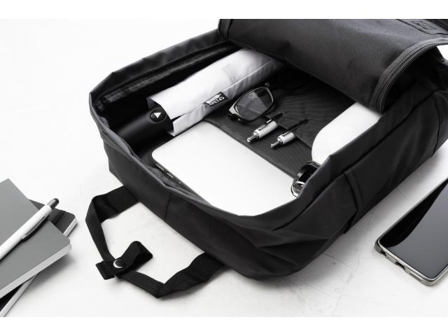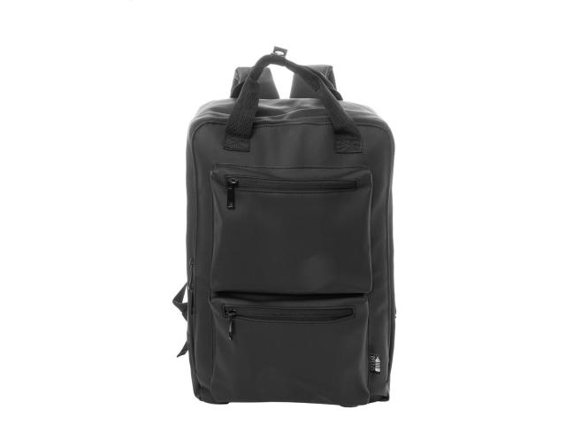 Waterproof, soft recycled PU leather backpack with zipped main compartment, 2 zipped front pockets, side pockets and padded laptop (15") and tablet (10") compartment. With padded back and shoulder straps. With distinctive recycled PU label.