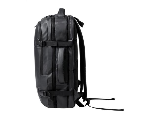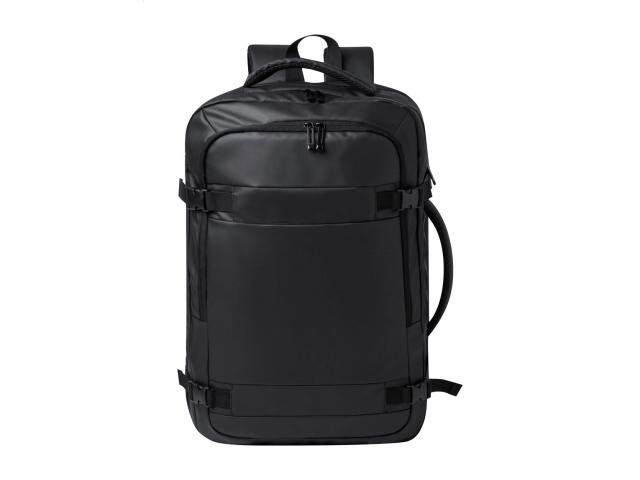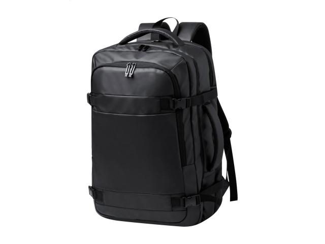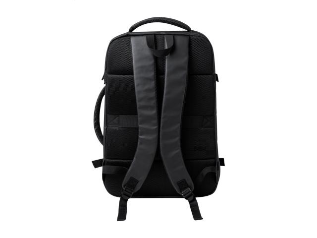 Dual function backpack and document bag in PU leather with zipped compartments, padded laptop (17") and mesh compartment, trolley strap, padded back and shoulder straps.
