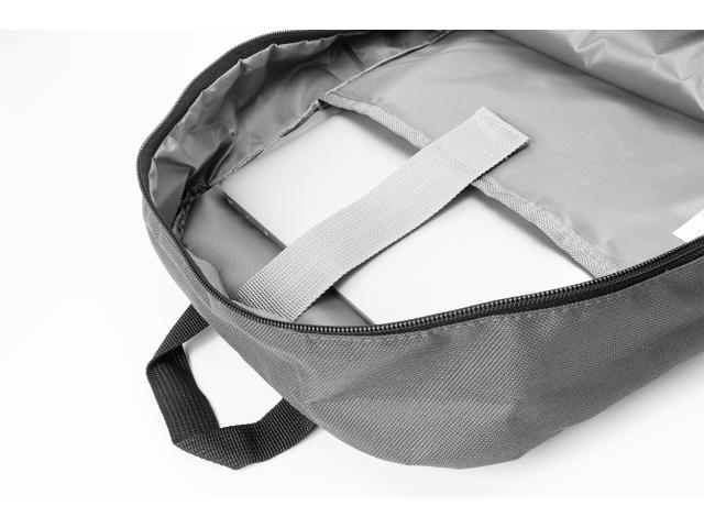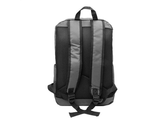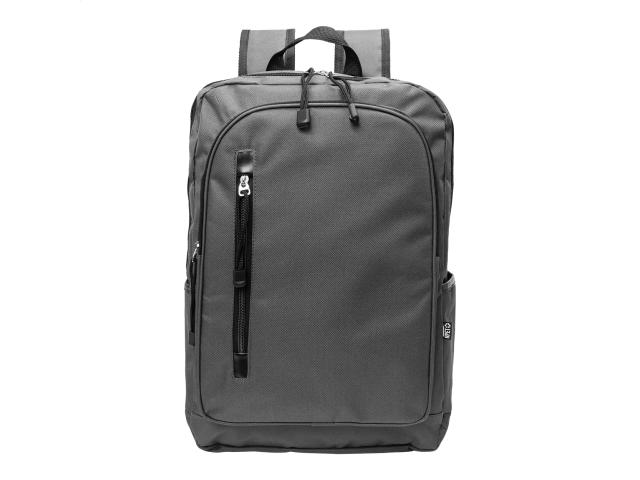 RPET backpack with zipped main compartment, 2 zipped front pockets, side pockets and padded laptop (15") compartment. With padded back and shoulder straps. 600D RPET polyester, with distinctive RPET label.
