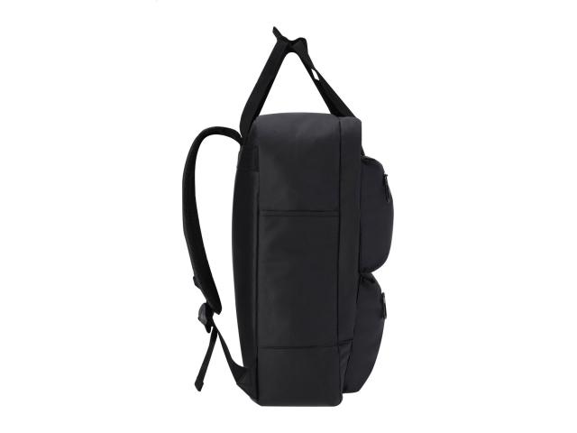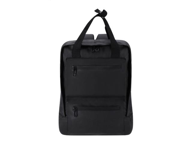 Soft PU leather backpack with zipped compartment and front pockets, padded laptop (15") and tablet (10") compartment, padded back and shoulder straps.