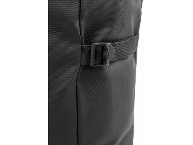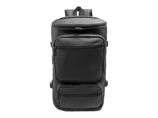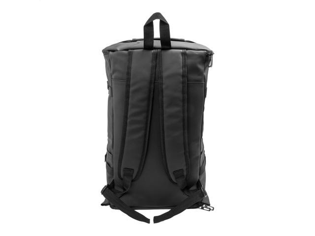 Waterproof RPET backpack with zipped main compartment, 2 zipped front pockets, side pockets and zipped shoe compartment. With padded laptop (15") compartment, padded back and shoulder straps. With size-adjustment side straps. PU coated 600D RPET polyester, with distinctive RPET label.