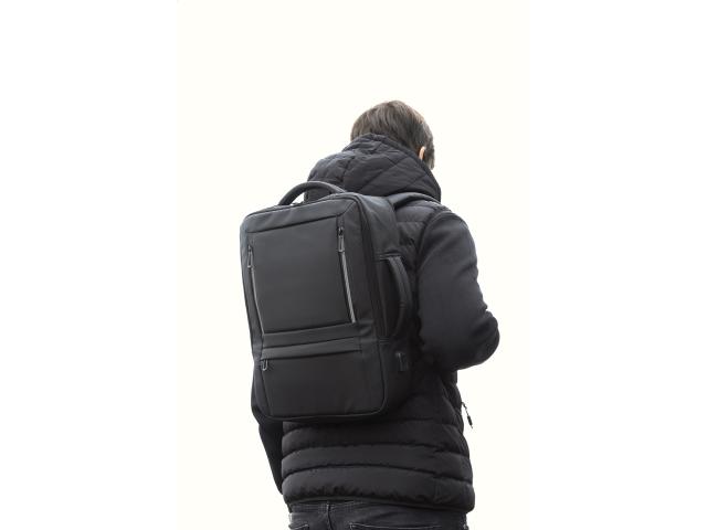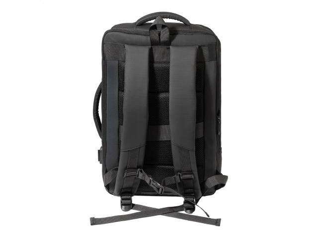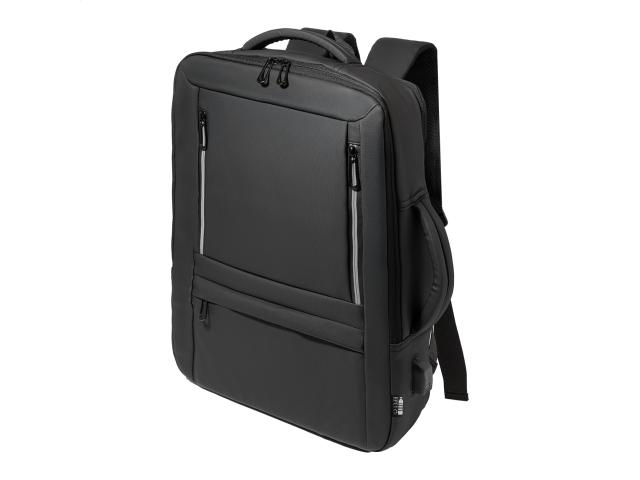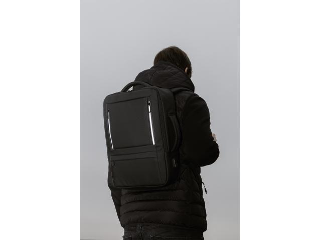 Waterproof, RPET extendable backpack and document bag with zipped main compartment, front pockets with reflective zippers, padded laptop (15") and tablet (12") compartment, and built-in USB port for power banks. With trolley strap, padded back and shoulder straps with chest strap. PU coated 600D RPET polyester, with distinctive RPET label.
