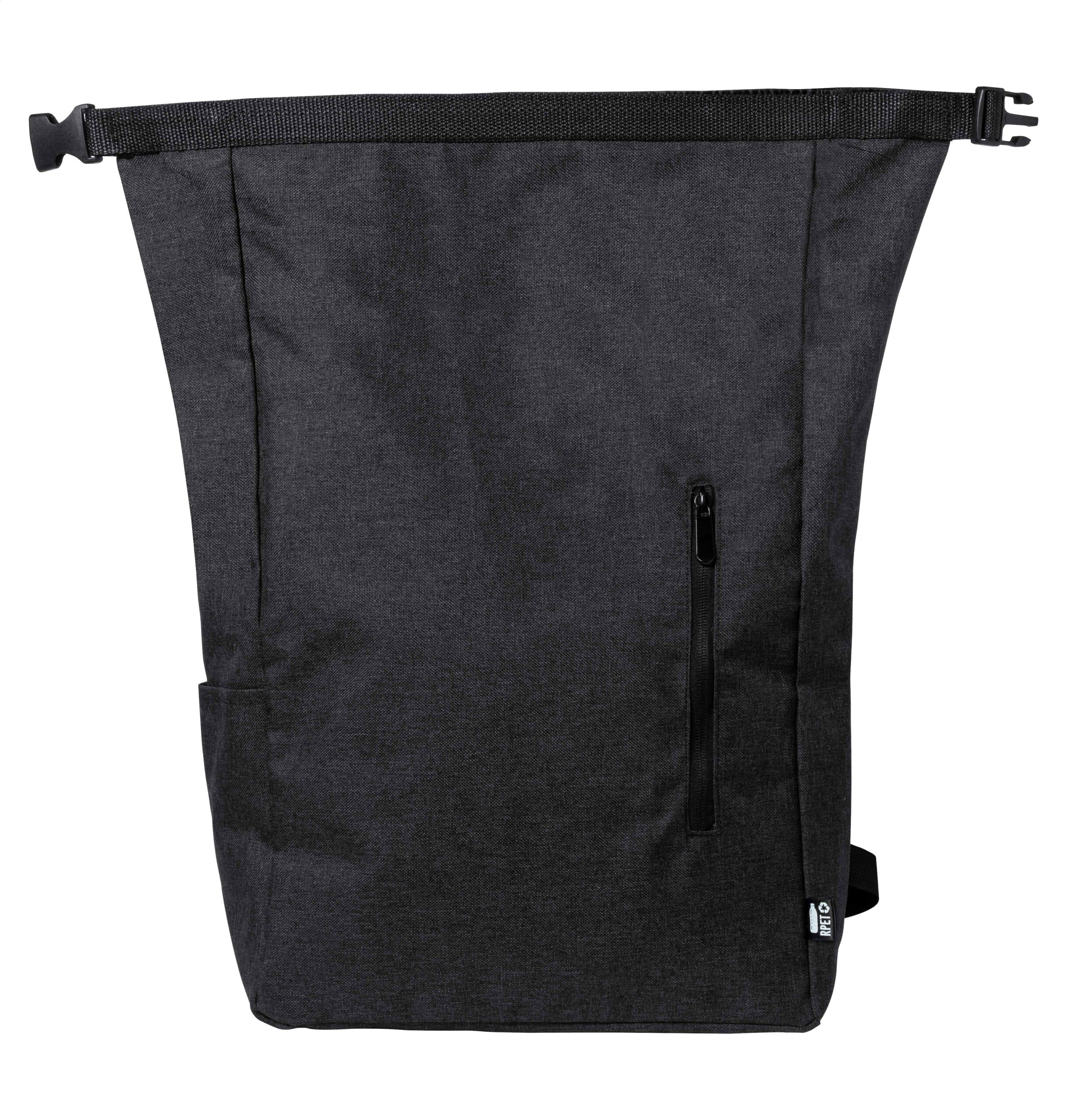 Waterproof, rolltop backpack in RPET with side pocket, zipped front pocket, padded back and shoulder straps. With distinctive RPET label. 300D RPET polyester.
