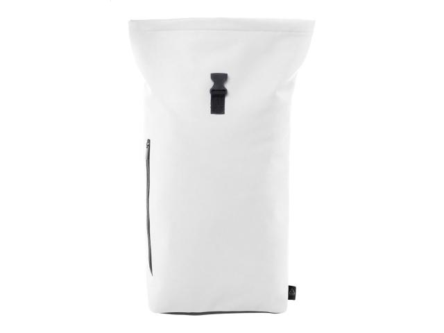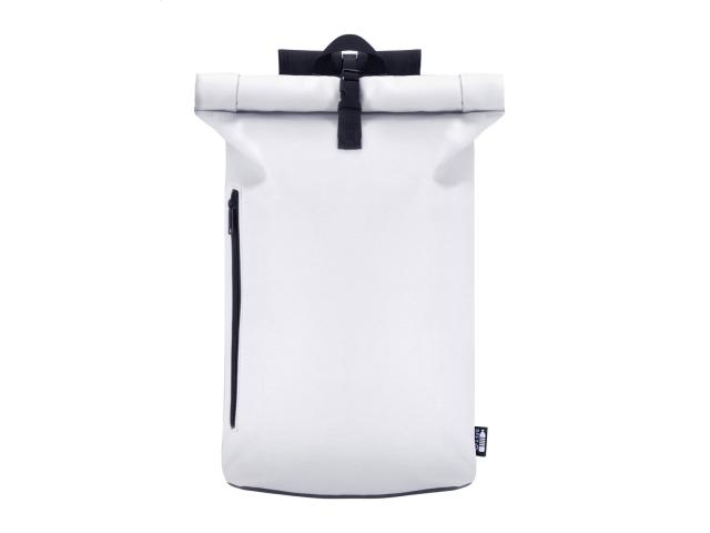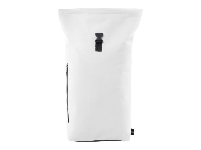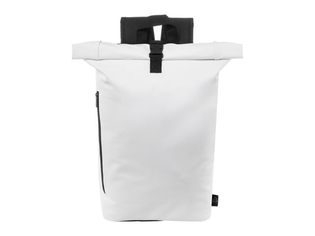 Waterproof, soft recycled PU leather rolltop backpack with buckle closure, zipped front pocket and padded laptop (15") compartment. With padded back and shoulder straps. With distinctive recycled PU label.
