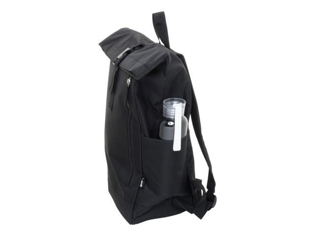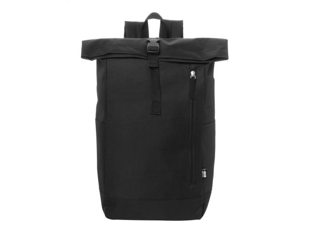 RPET rolltop backpack with buckle closure, laptop (14") compartment and zipped front pocket. With padded back and shoulder straps. 600D RPET polyester with distinctive RPET label.