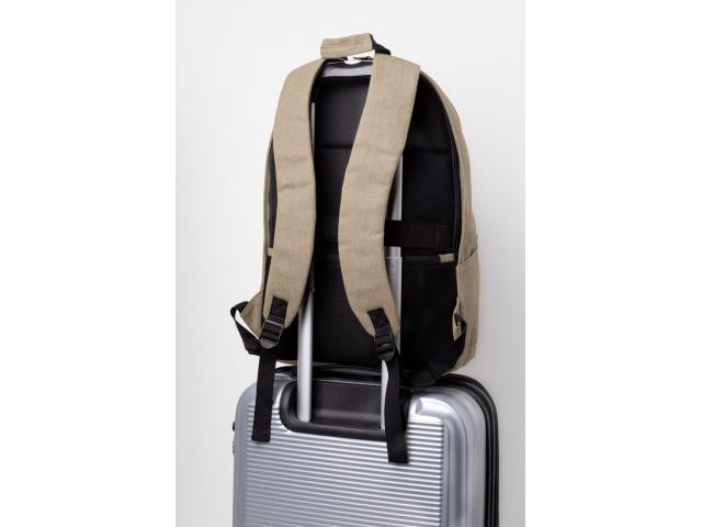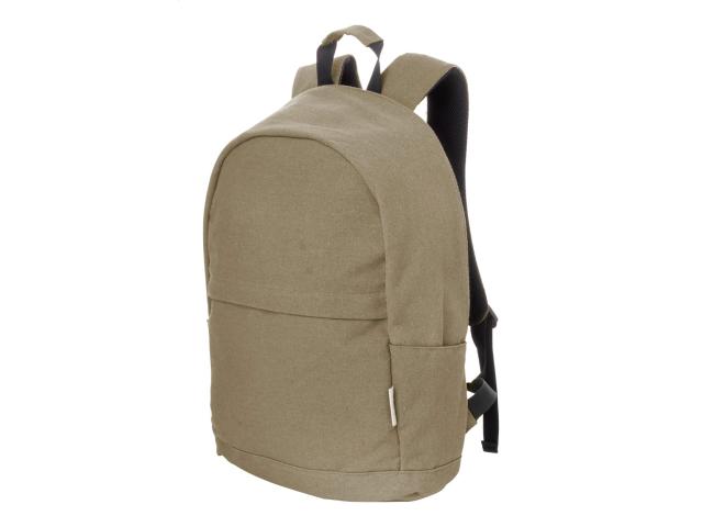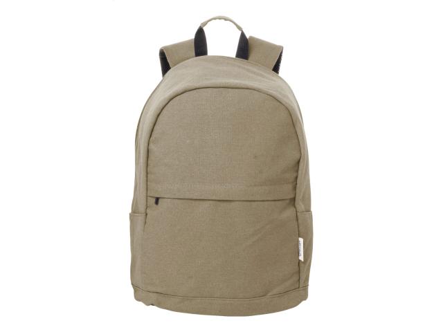 Recycled canvas backpack with zipped main compartment, padded laptop (15") compartment, zipped front pocket, side pockets, trolley strap, padded back and shoulder straps. With hidden anti-theft pocket. 70% recycled cotton and 30% RPET polyester. With distinctive recycled cotton label.