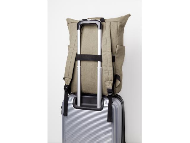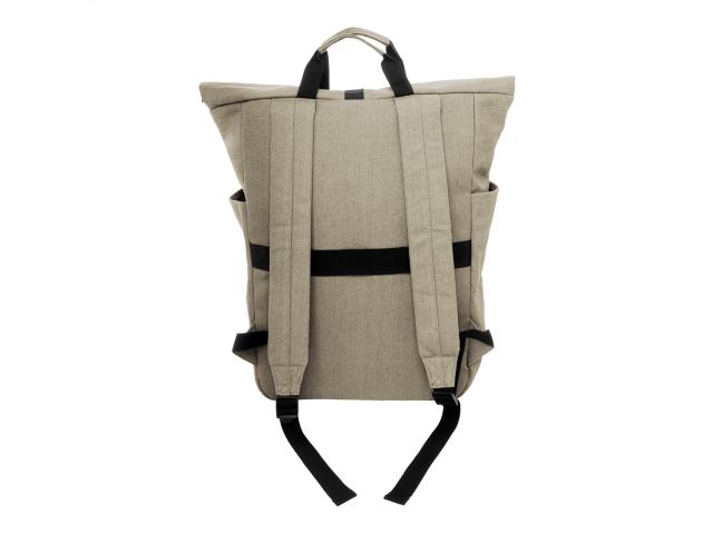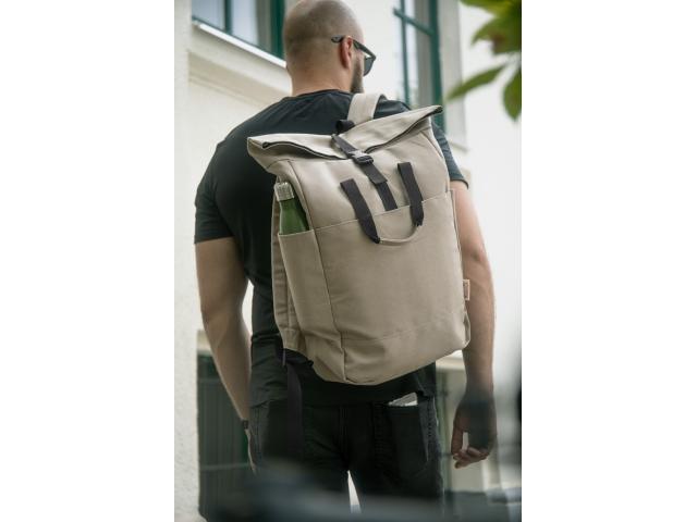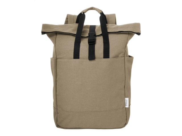 Recycled canvas rolltop backpack with buckle and velcro closure, padded laptop (15") compartment, front and side pockets. With trolley strap, padded back and shoulder straps. 70% recycled cotton and 30% RPET polyester. With distinctive recycled cotton label.
