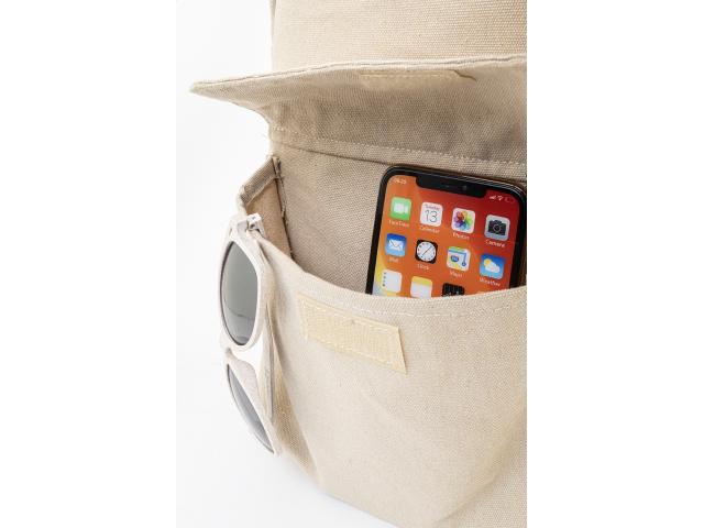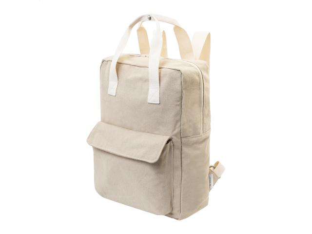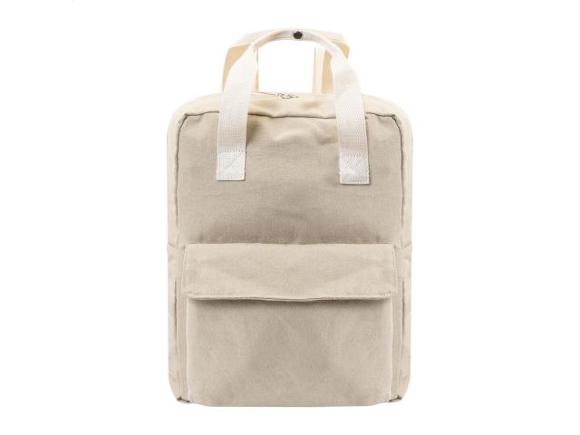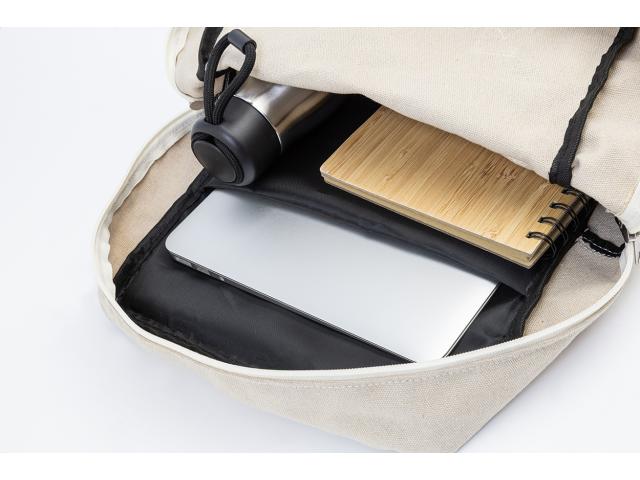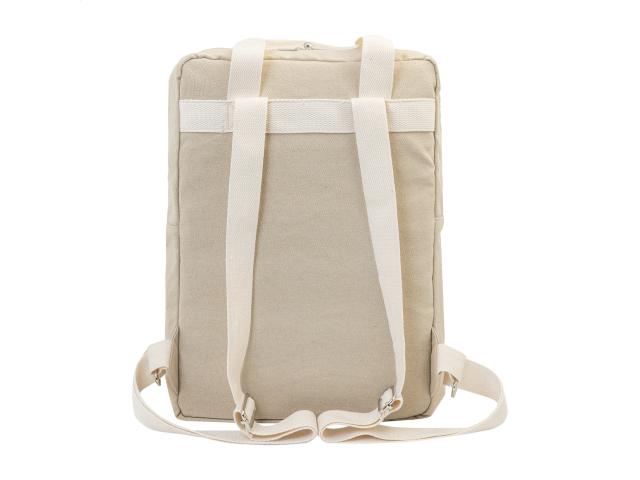 Recycled canvas backpack with zipped main compartment, padded laptop (13") compartment and velcro closure front pocket. 70% recycled cotton and 30% RPET polyester. With distinctive recycled cotton label.