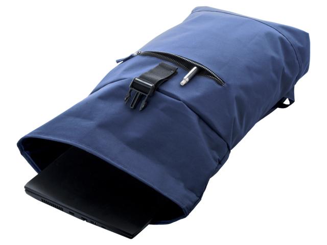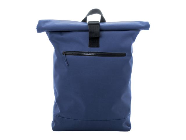 RPET rolltop backpack with buckle closure, zipped front pocket, padded laptop (15") compartment, padded back and shoulder straps. 600D RPET polyester with distinctive RPET label.
