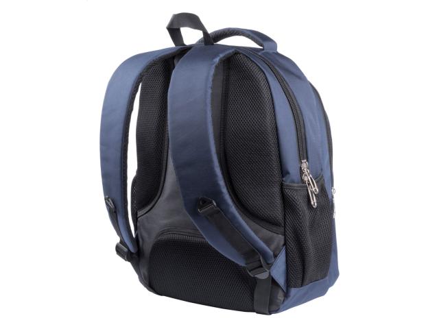 600D nylon backpack with multiple zipped compartments, padded laptop pocket (15"), back and shoulder straps.