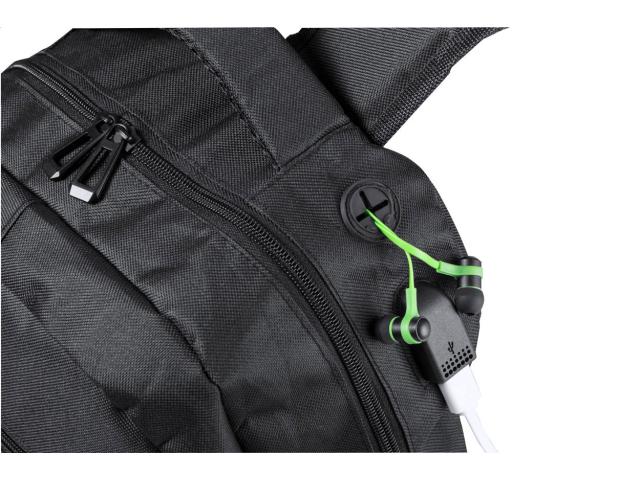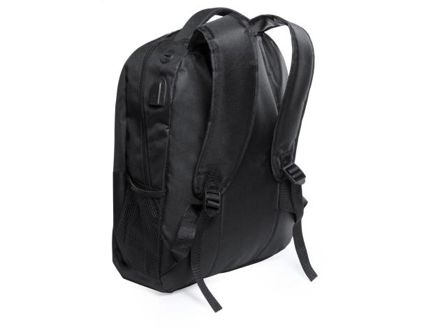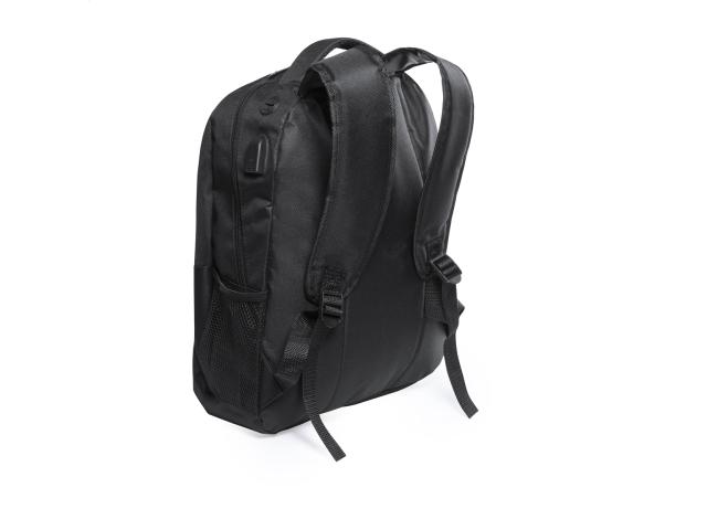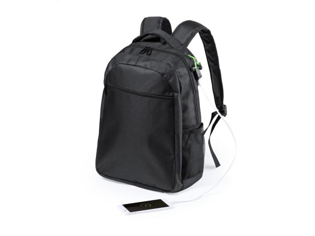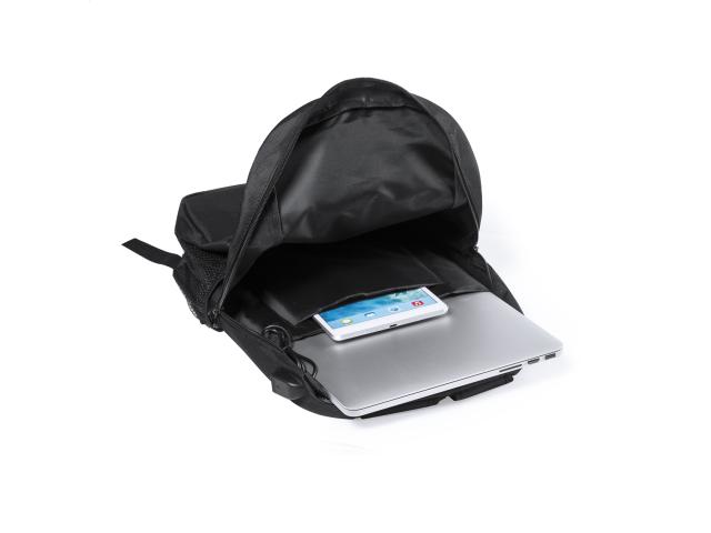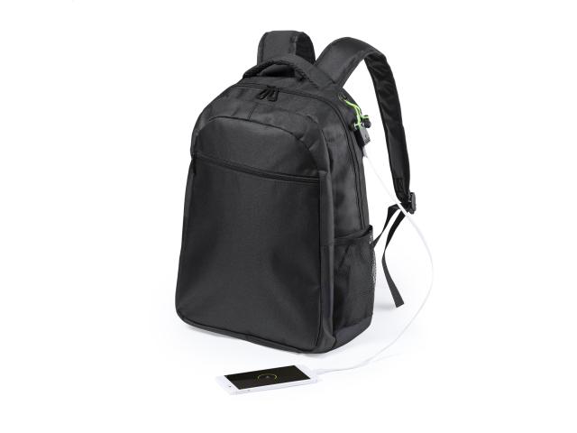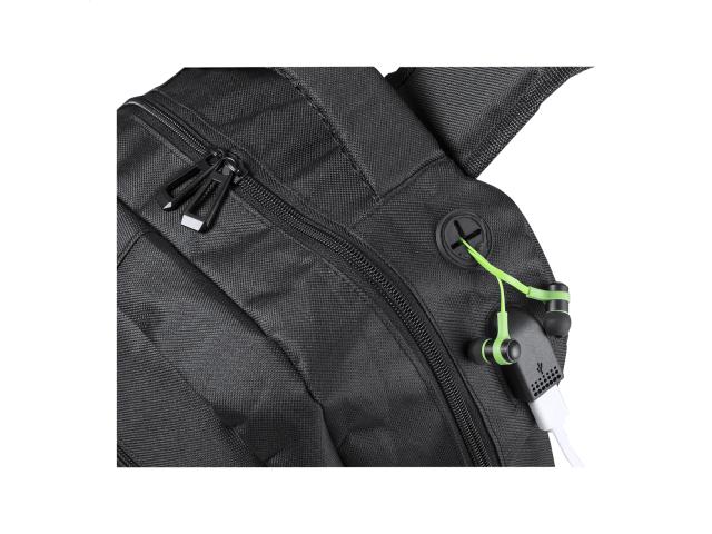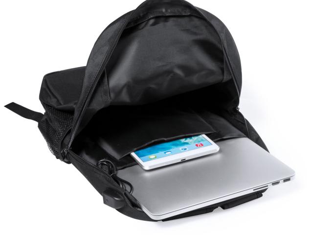 Waterproof backpack with zipped compartments, padded laptop (15") and tablet (10") compartment, padded back and shoulder strap. With earphone outlet and built-in USB connection for power banks. 600D polyester.