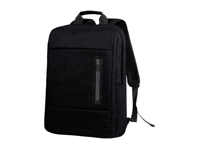 Backpack with multiple zipped compartments, ergonomic back, padded shoulder straps and laptop compartment (15"). 600D polyester.