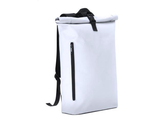 Soft PU leather rolltop backpack with buckle closure, zipped front pocket, padded laptop (15") compartment, padded back and shoulder straps.