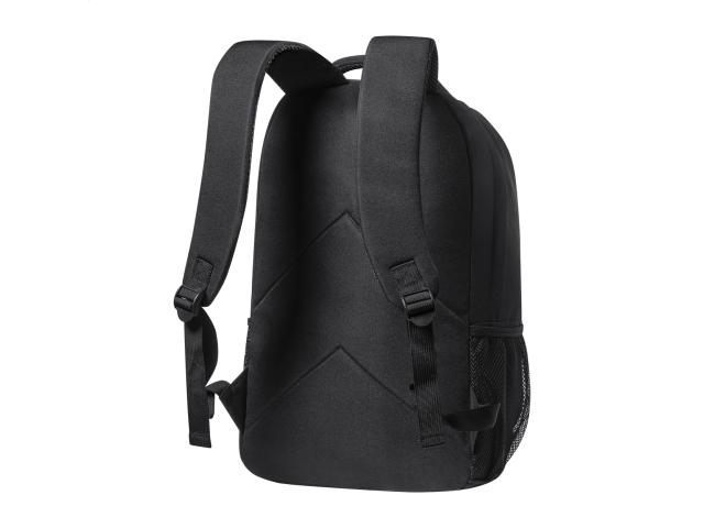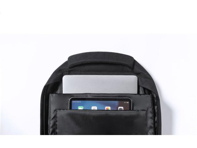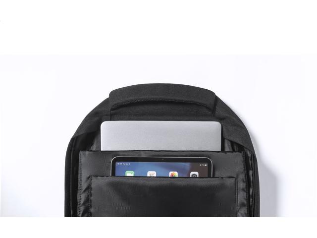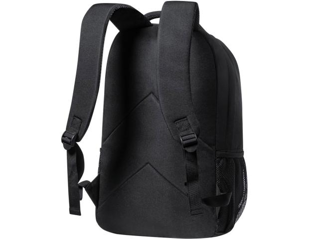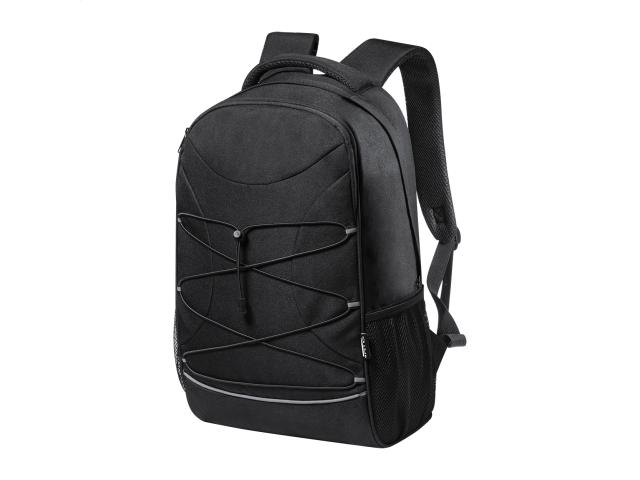 RPET backpack with zipped compartments, mesh side pockets, elastic cords on the front, padded laptop (15") and tablet (12") compartment, padded back and shoulder straps. With distinctive RPET label. 600D RPET polyester.