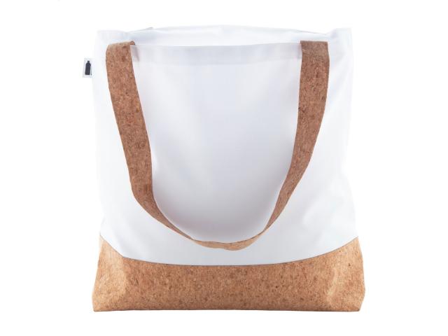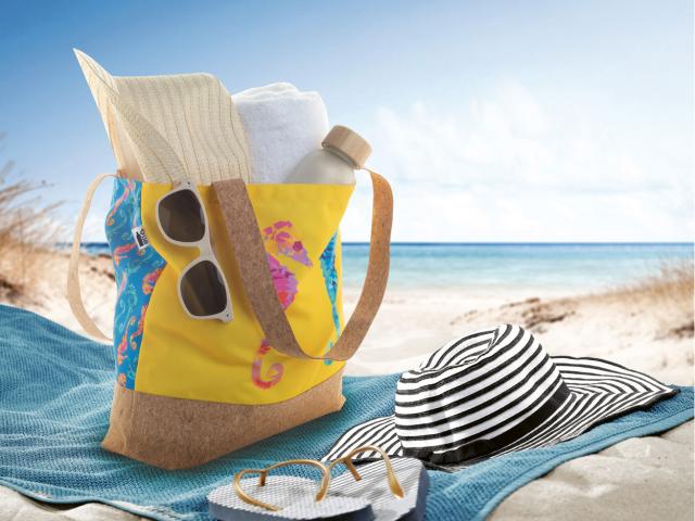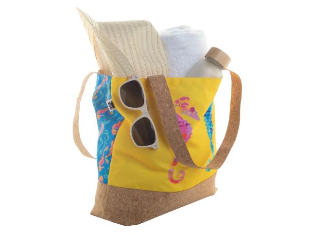 Custom made beach bag in 600D RPET polyester and natural cork. With all over sublimation printed graphics and distinctive RPET label. MOQ: 25 pcs.