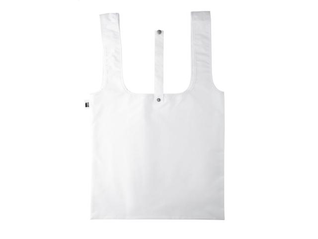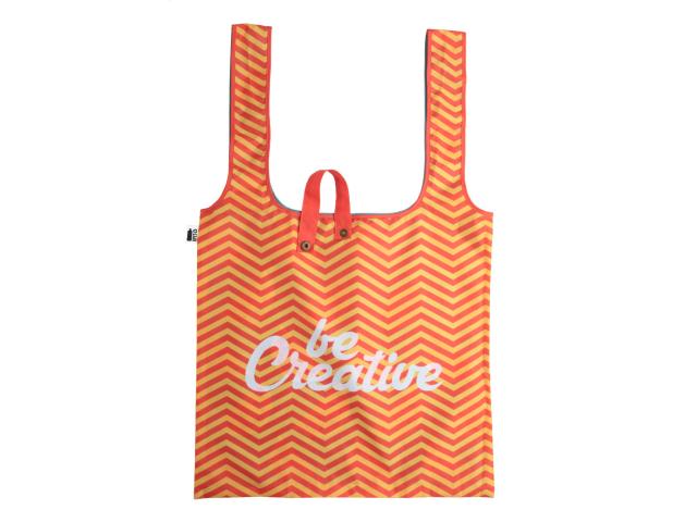 Custom made, foldable shopping bag in 190T RPET polyester. With all over sublimation printed graphics and distinctive RPET label. MOQ: 25 pcs.