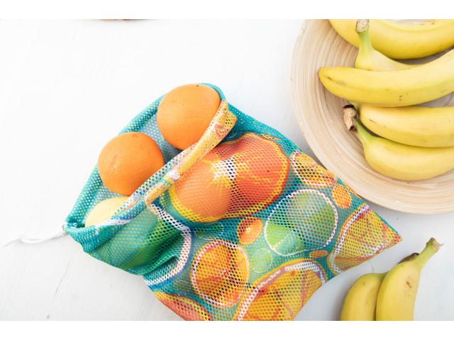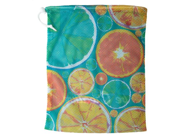 Custom made polyester mesh produce bag with drawstring closure. With all over sublimation printed graphics. MOQ: 50 pcs.