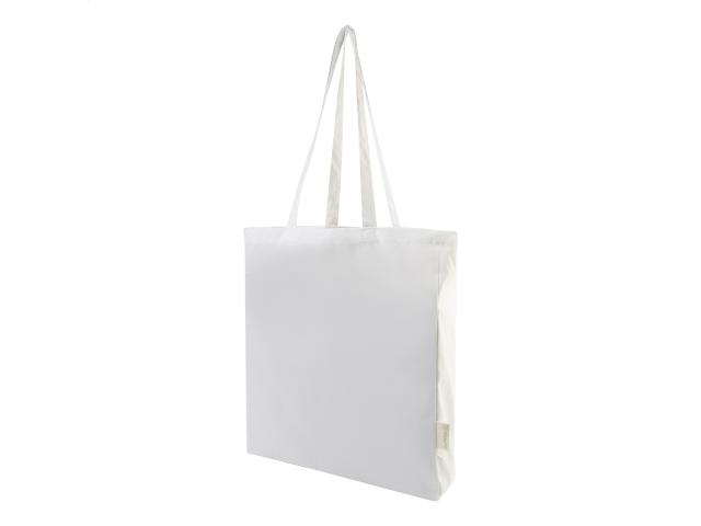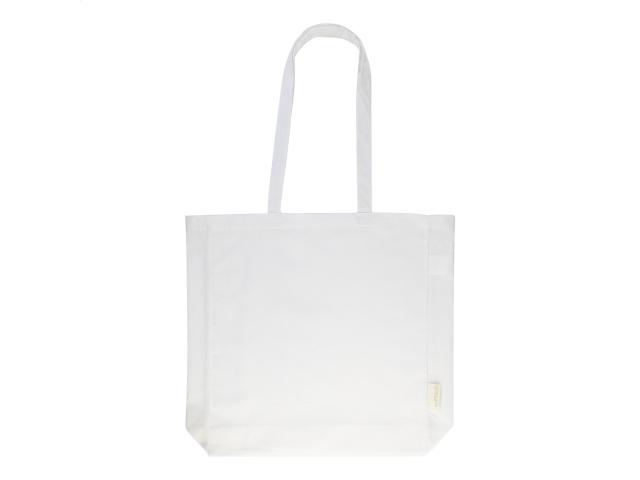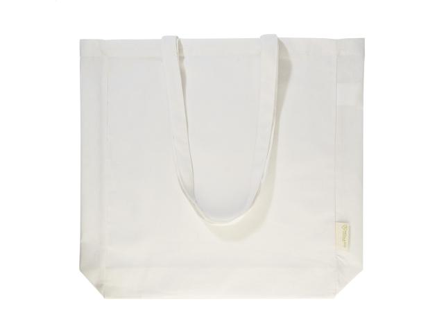 Shopping bag with gusset and long handles in 70% recycled cotton and 30% RPET polyester, 140 g/m². With distinctive recycled cotton label.