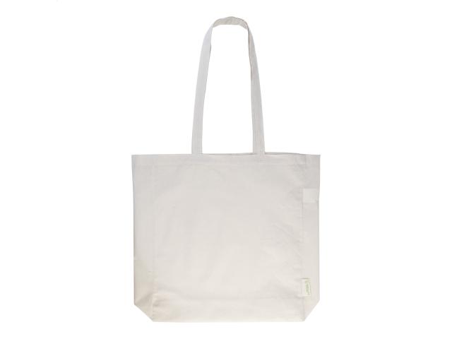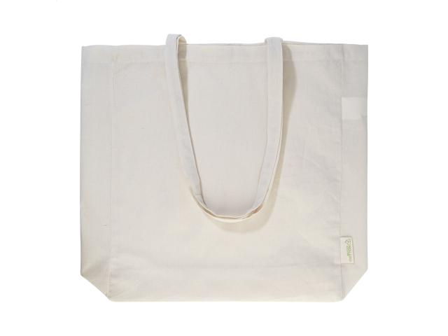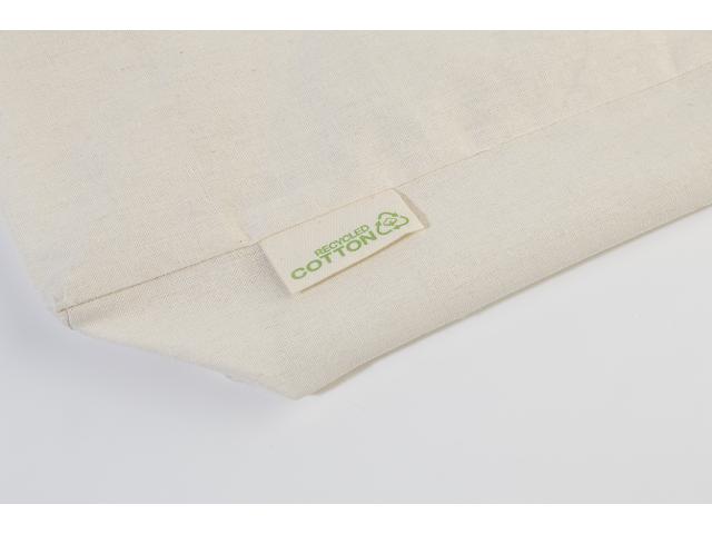 Shopping bag with gusset and long handles in 70% recycled cotton and 30% RPET polyester, 140 g/m². With distinctive recycled cotton label.