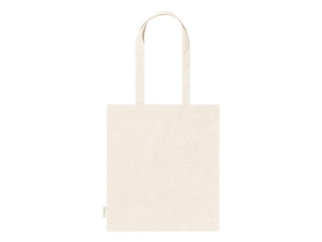 Reusable, recycled cotton shopping bag with long handles and distinctive recycled cotton label. 100% recycled cotton, 140 g/m².