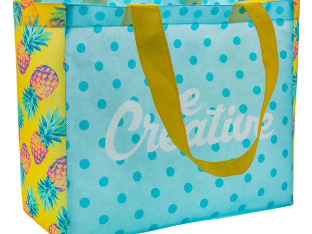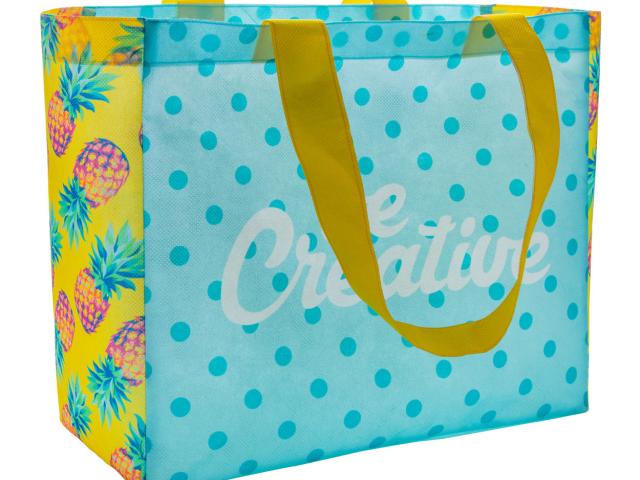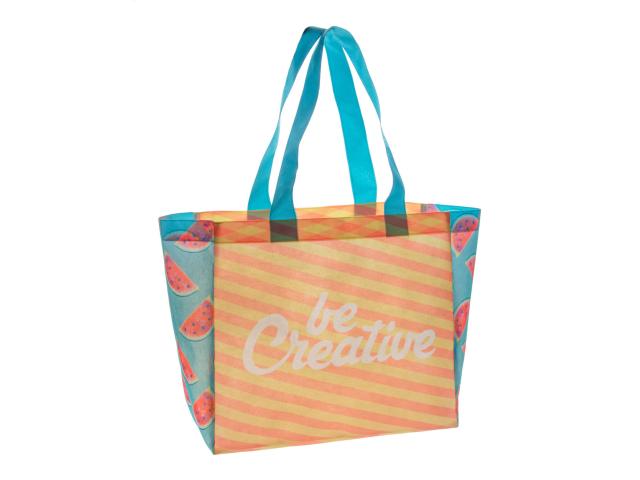 Custom made non-woven shopping bag with gusset and long handles, 80 g/m². With all over sublimation printed graphics. MOQ: 25 pcs.