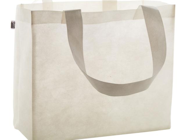 Custom made, RPET non-woven shopping bag with gusset and long handles, 80 g/m². With all over sublimation printed graphics and distinctive RPET label. MOQ: 25 pcs.