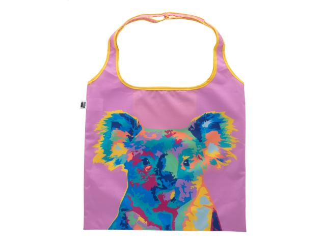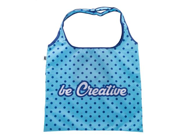 Custom made, foldable shopping bag in 190T RPET polyester. With all over sublimation printed graphics and distinctive RPET label. MOQ: 25 pcs.