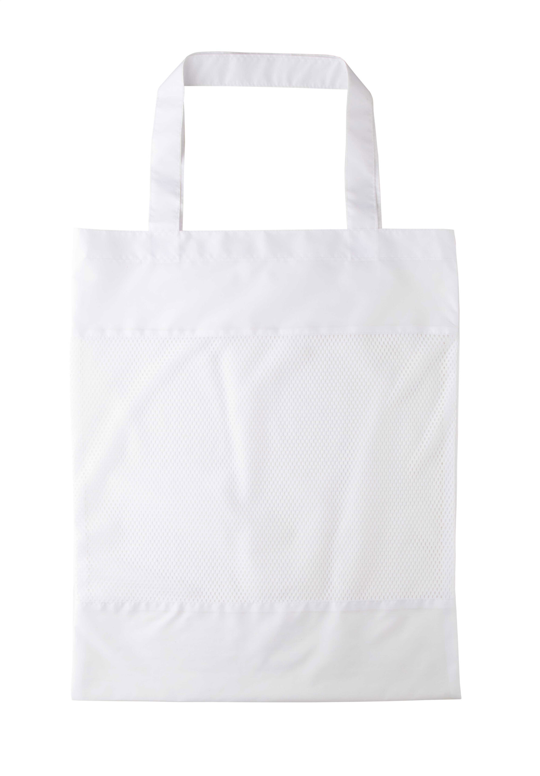 Custom made shopping bag in 190T polyester, with polyester mesh front and long handles. With all over sublimation printed graphics (excluding mesh part). MOQ: 25 pcs.
