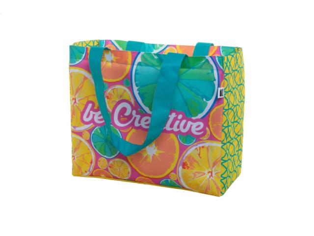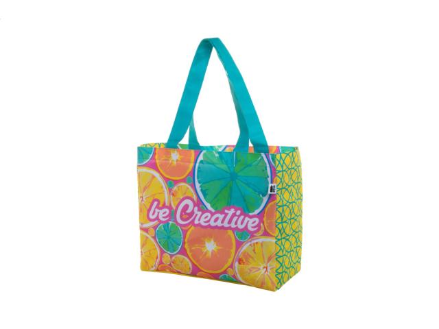 Custom made, 600D RPET polyester shopping bag with gusset and long handles. With all over sublimation printed graphics and distinctive RPET label. MOQ: 25 pcs.