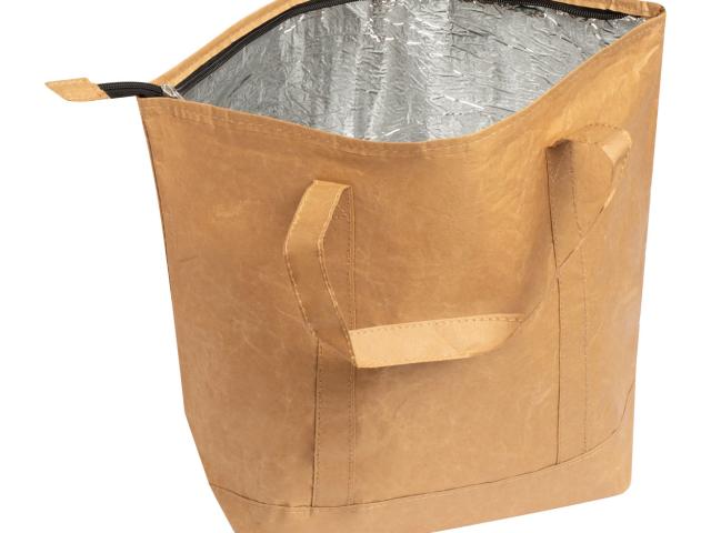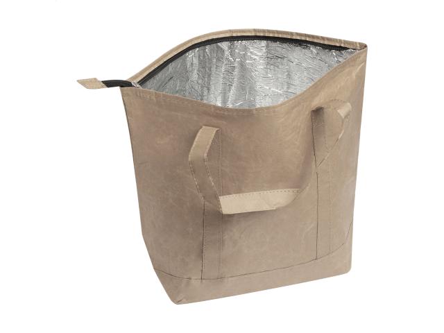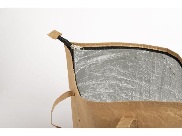 Zipped, laminated recycled paper cooler bag with aluminium padding and short handles.