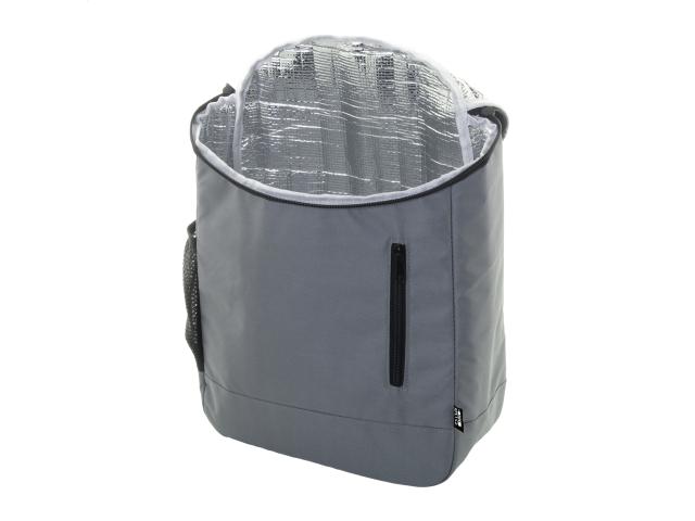 RPET cooler backpack with aluminium padding, mesh side pocket, zipped main compartment and front pocket. 600D RPET polyester, with distinctive RPET label.