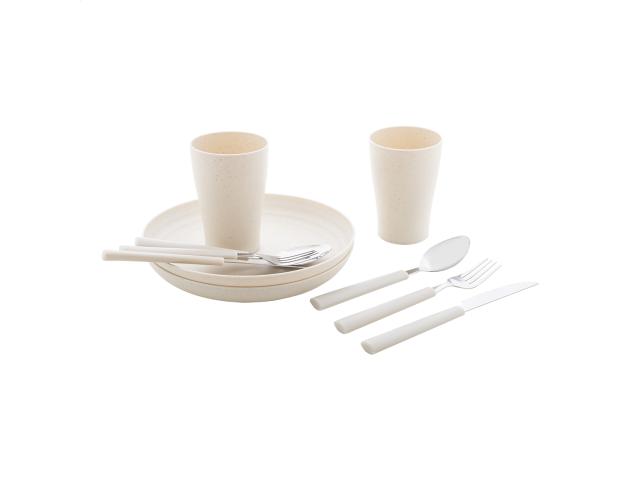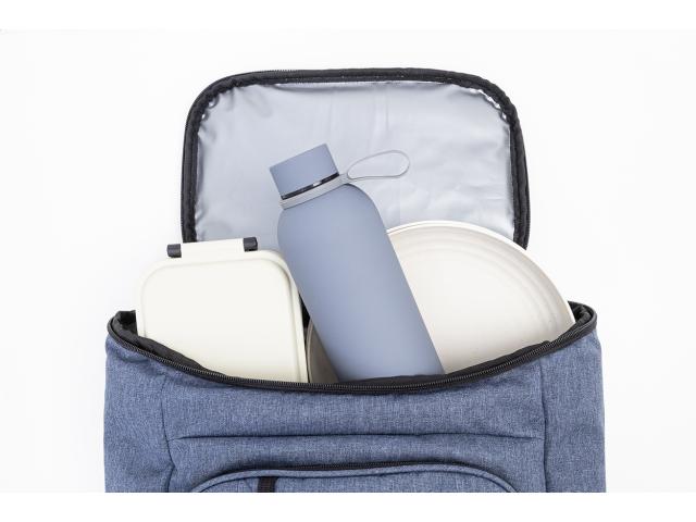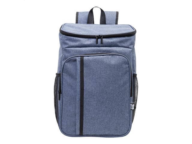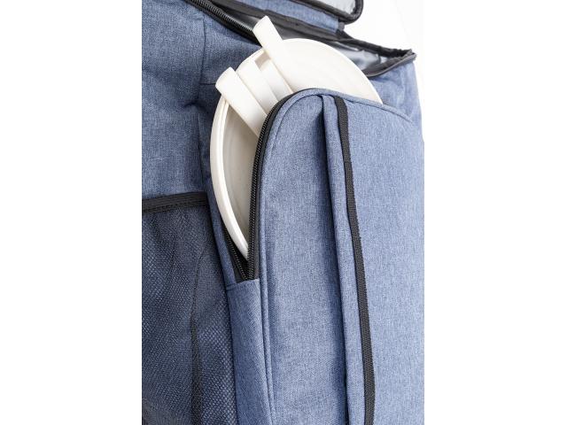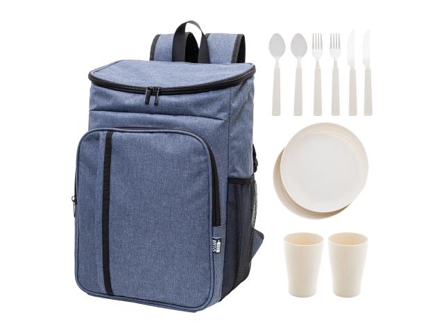 RPET cooler picnic backpack with zipped front pocket and zipped cooler compartment with PEVA padding. With mesh side pockets, padded back and shoulder straps. Including PP and stainless steel tableware for 2 people: 2 plates, 2 cups, 2 forks, 2 spoons and 2 knives. 600D RPET polyester, with distinctive RPET label.
