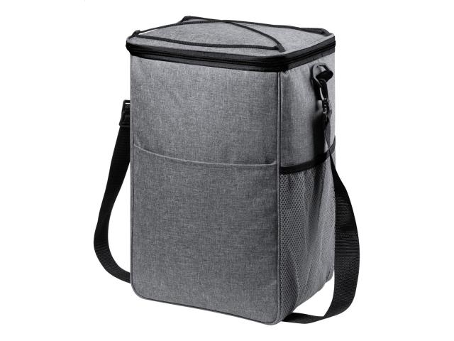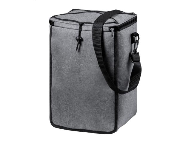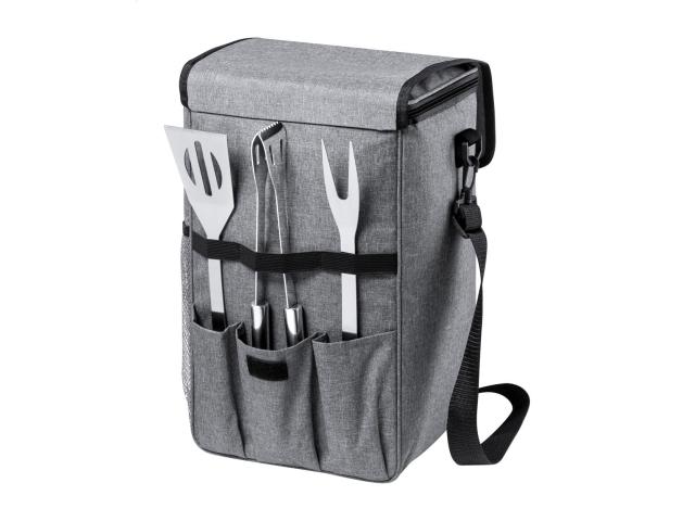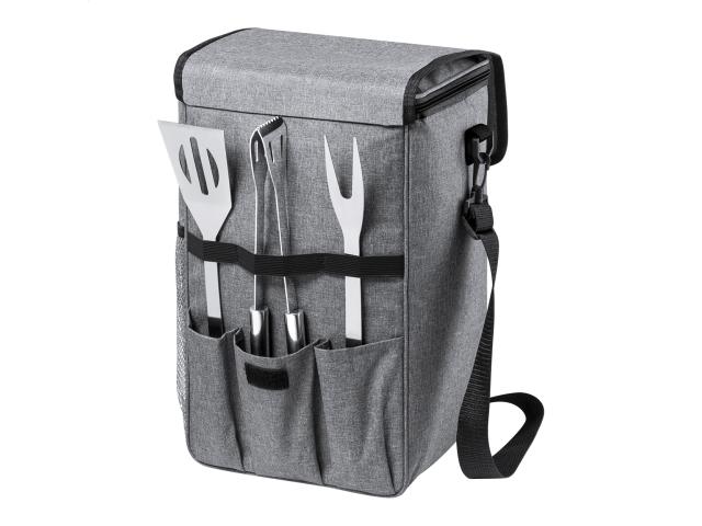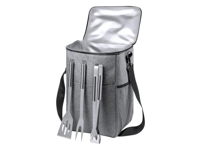 RPET cooler bag with PEVA padding, zipped compartment and adjustable shoulder strap. Including 3 pc stainless steel barbecue set (fork, shovel and clip). 600D RPET polyester with distinctive RPET label.