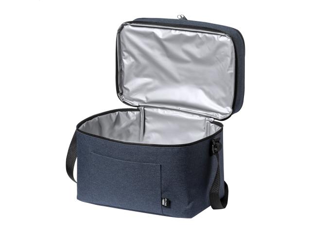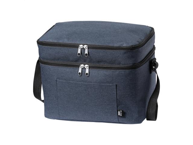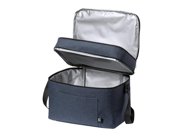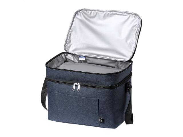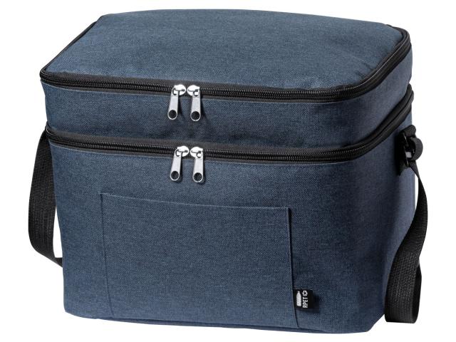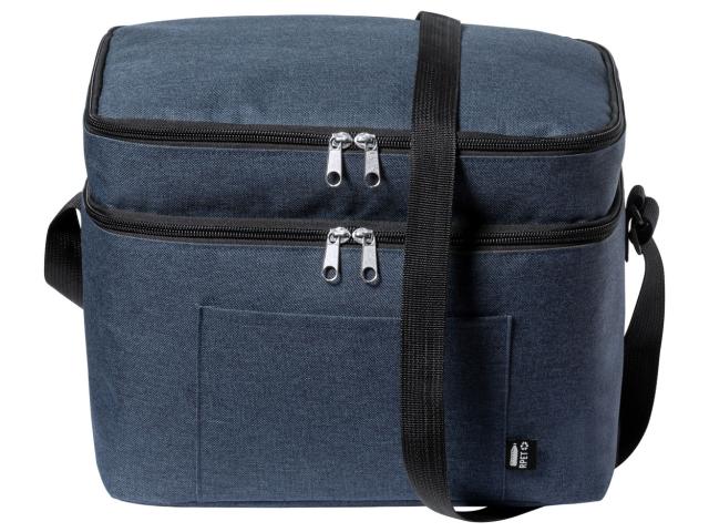 600D RPET polyester cooler bag with PEVA padding, with 2 zipped compartment and adjustable shoulder strap. With distinctive RPET label.