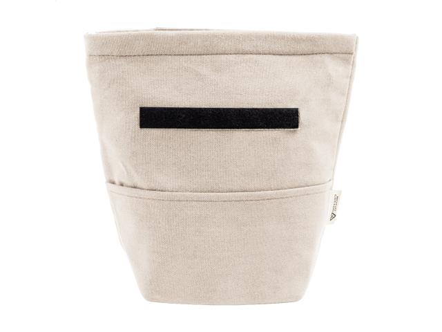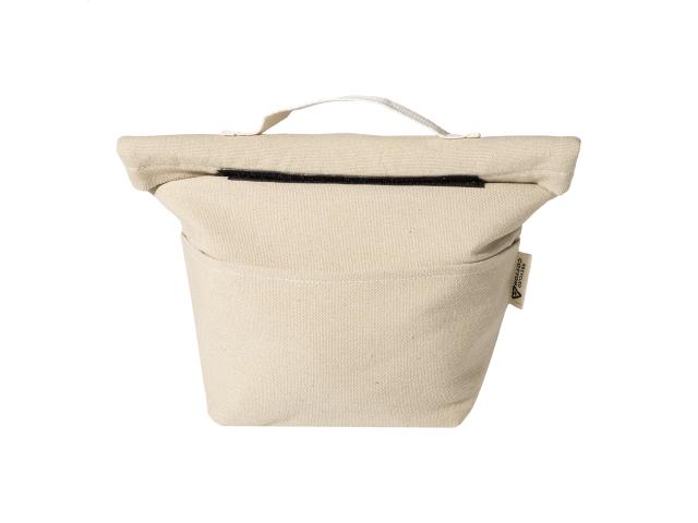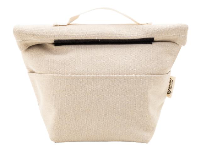 Recycled canvas rolltop cooler bag with front pocket, aluminium padding and velcro closure. 70% recycled cotton and 30% RPET polyester. With distinctive recycled cotton label.