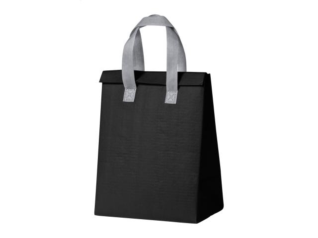 Laminated non-woven cooler bag with handles, velcro closure and aluminium padding.