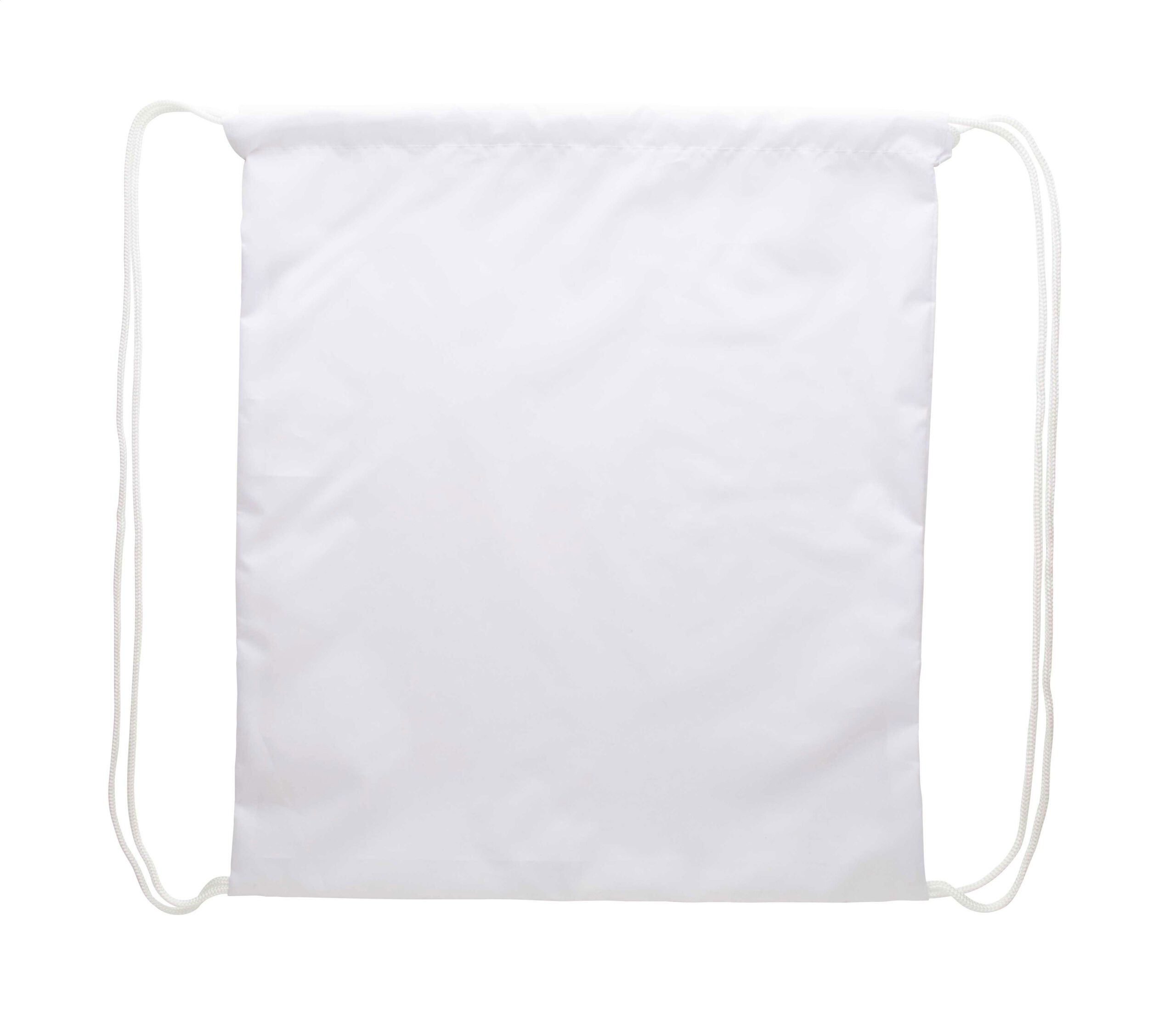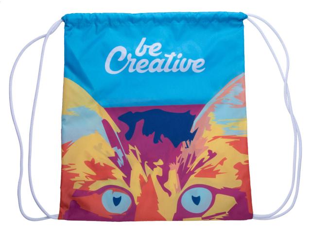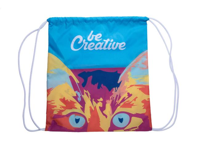 Custom made drawstring bag with coloured strings, 190T polyester. With all over sublimation printed graphics. MOQ: 25 pcs.