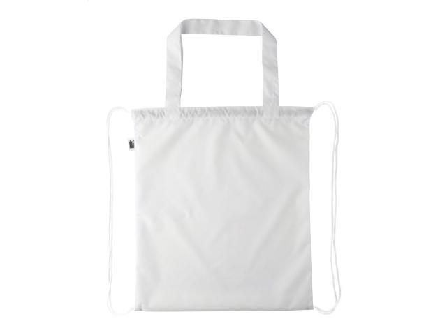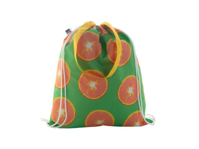 Custom made drawstring bag with coloured strings and long handles, 190T RPET polyester. It can be also used as a shopping bag. With all over sublimation printed graphics and distinctive RPET label. MOQ: 25 pcs.
