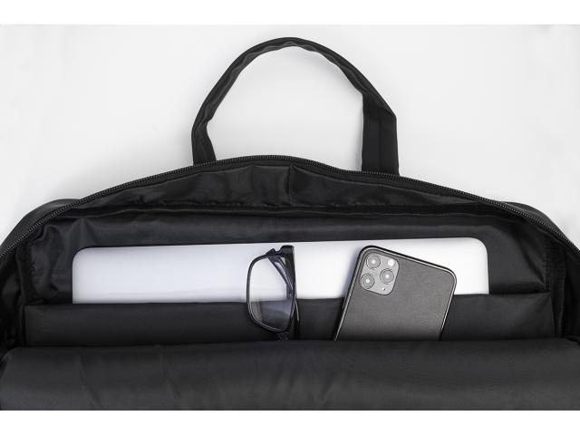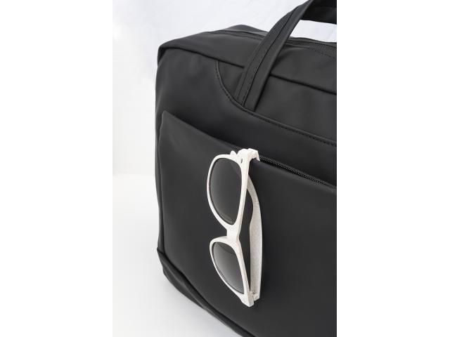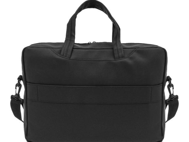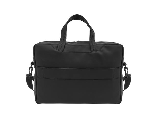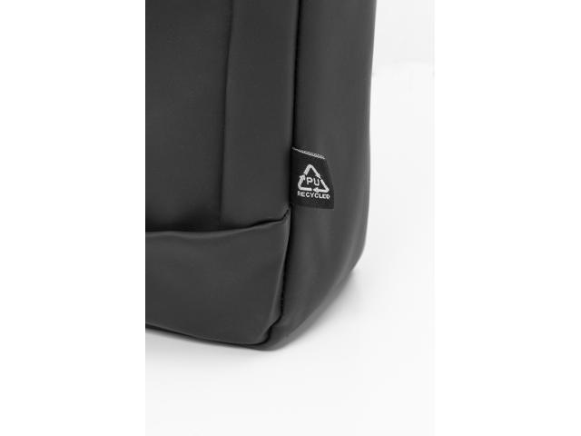 Waterproof, soft recycled PU leather document and laptop bag with zipped compartment, zipped front pocket, adjustable shoulder strap and padded laptop compartment (15"). With distinctive recycled PU label.